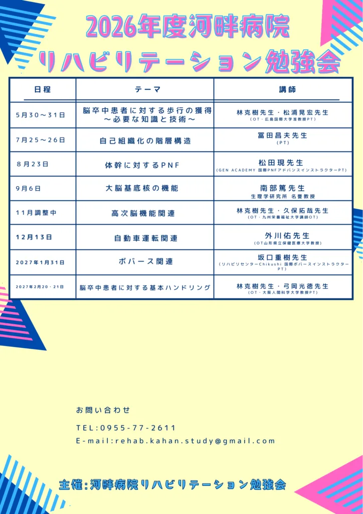 2026年度河畔病院リハビリテーション勉強会は脳卒中勉強会、情動と報酬に関して、PNF、ボバース、脳生理、自動車運転関連など研修会を企画予定です。